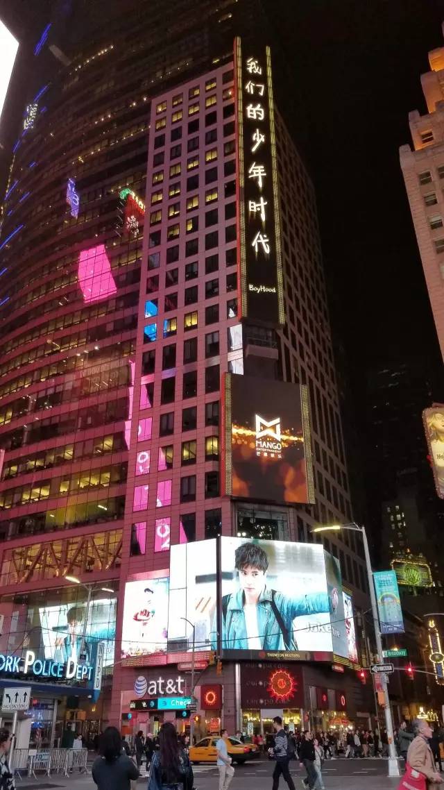 由湖南卫视、湖南芒果娱乐有限公司、北京时代峰峻文化艺术发展有限公司、上海上象星作影视文化投资有限公司联合出品,成志超导演,郭敬明监制,TFBOYS王俊凯、TFBOYS王源、TFBOYS易烊千玺、薛之谦、李小璐、唐禹哲、张子枫、李菲儿、程砚秋、李世鹏、潘粤明、丁程鑫等主演的校园青春励志偶像剧《我们的少年时代》在纽约时代广场上屏,TFBOYS霸气登陆纽约,薛之谦携手李小璐护航少年时代。