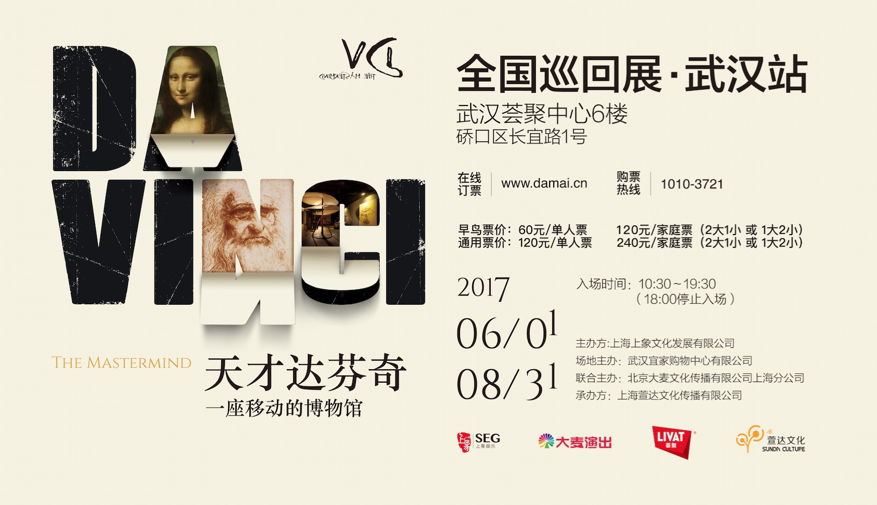 此次[天才达芬奇•移动博物馆]全国巡回展览武汉站由上象娱乐、大麦演出共同联合举办,该展览将于2017年6月1日至2017年8月31日在武汉荟聚中心举行,门票也已于今日在“大麦网(www.damai.com)”及“大麦APP”上正式售卖,票价不仅包含120元~240元多个档位,还有专为暑期档定制的早鸟票更将低至60元。